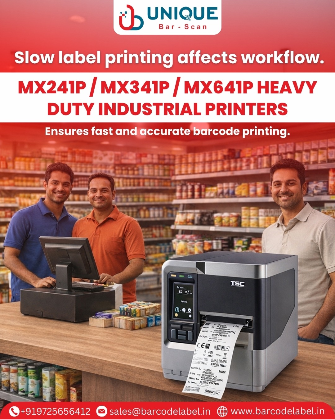 Unique Barscan Solutions is a leading Heavy-Duty Industrial Printers Manufacturer in Ahmedabad, offering advanced labeling solutions for manufacturing, logistics, retail, and healthcare industries. Our TSC MX241P, MX341P, and MX641P printers are designed for 24/7 high-volume industrial printing, featuring a durable die-cast aluminum body for reliable performance in demanding environments.